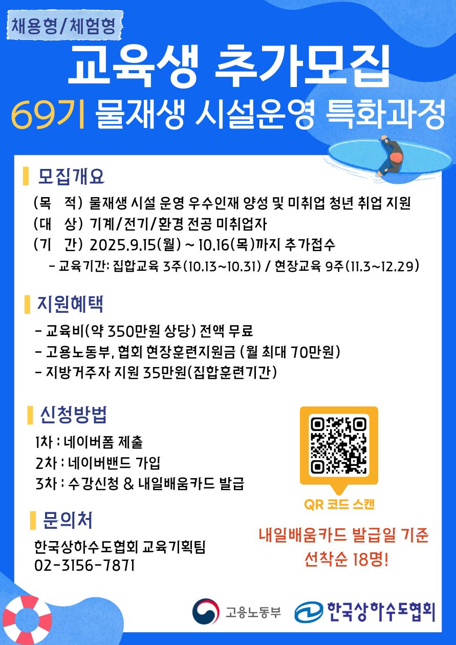 [한국상하수도협회] 물재생 시설운영 특화과정 우수훈련생 추가모집 추천요청(~10.16)