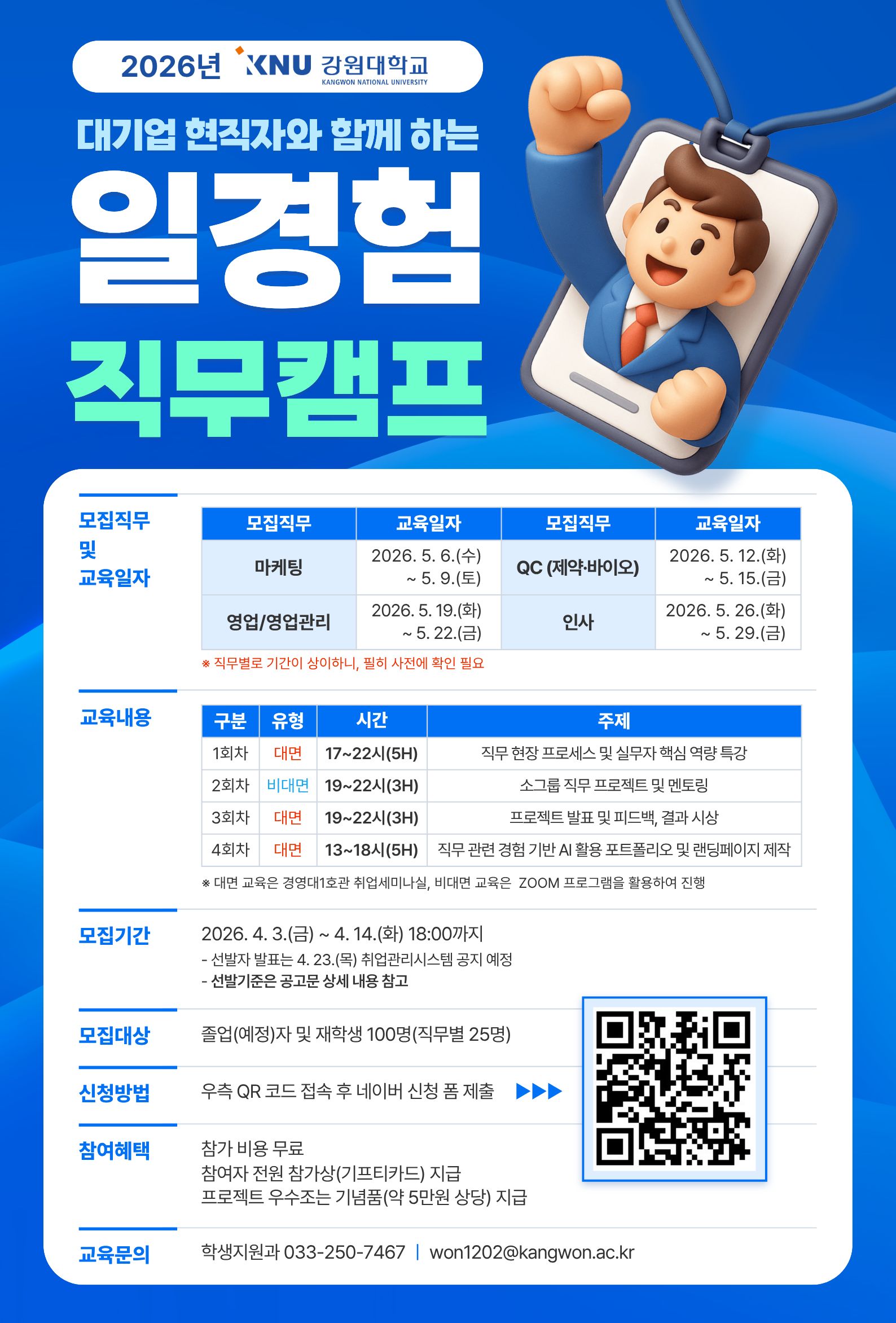 2. 직무 적합성 및 문제해결 능력 향상을 위한「2026-1학기 일경험 직무 캠프」를 다음과 같이 운영하오니 관심 있는 학생들이 신청할 수 있도록 안내하여 주시기 바랍니다.